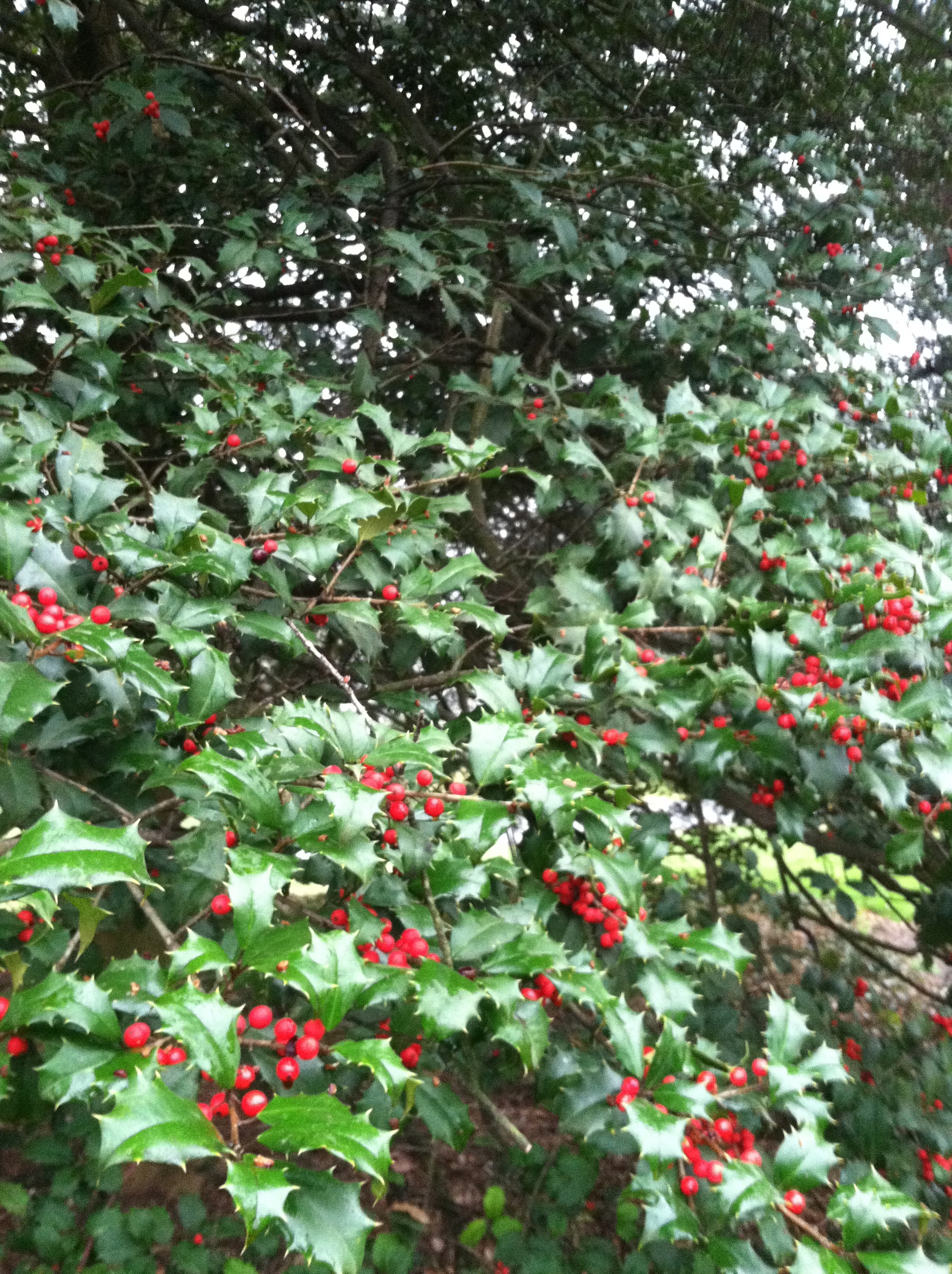 I thought about that wheel, how it’s been whirring in the background of my life for years now and will only get more insistent in the years ahead, I’m sure. I woke up in an emptied house and had an email from Adrienne, with a video of Emilio watching the candles being lit for his first Hanukkah. He burbled and chattered and ambled around the room, and I got up and made coffee. When it came time to take a final photograph this morning, the clusters of bright red berries on the big holly tree in the yard were what struck me. Already, the lawn beneath the tree was sprinkled red with fallen berries