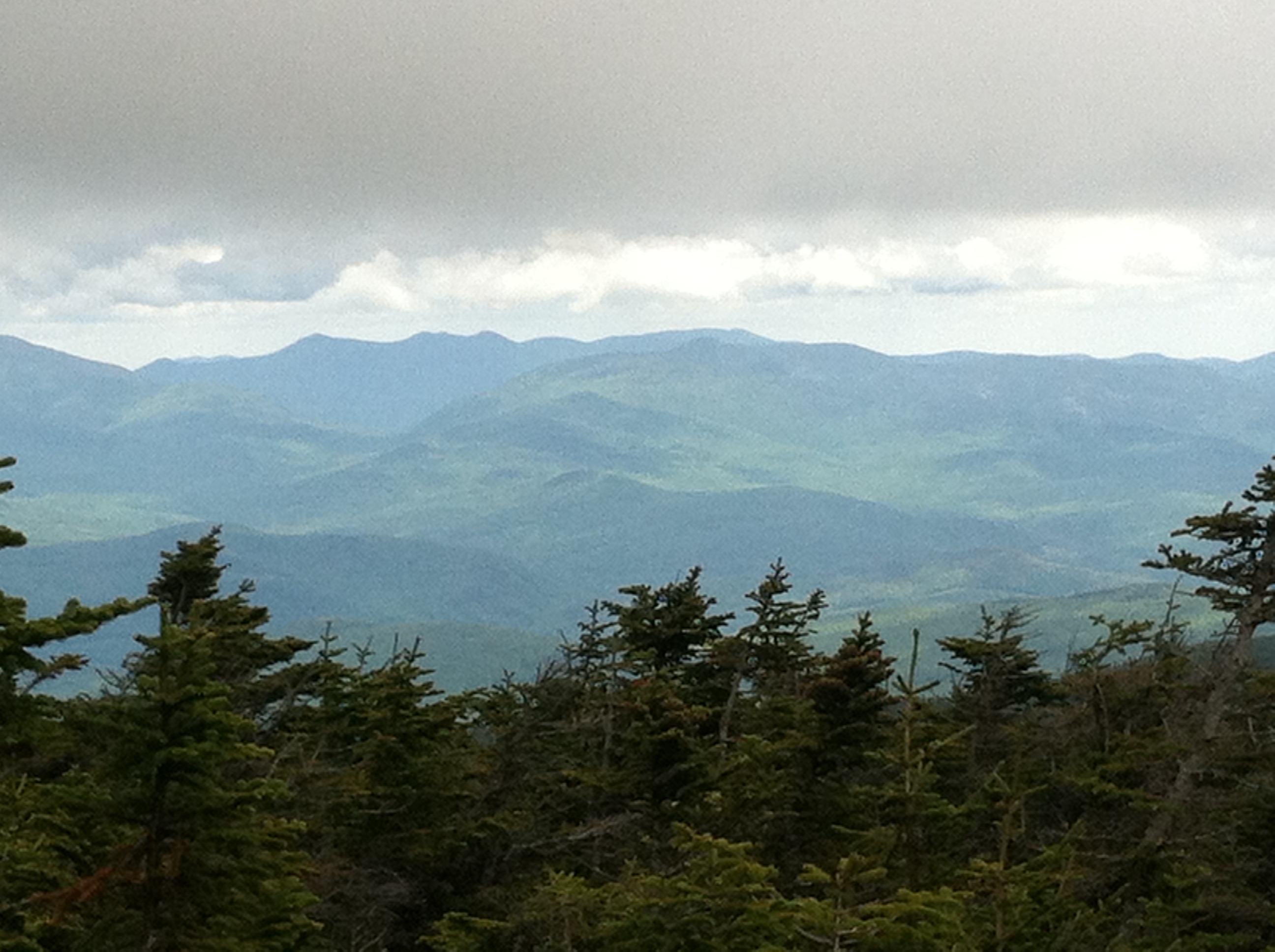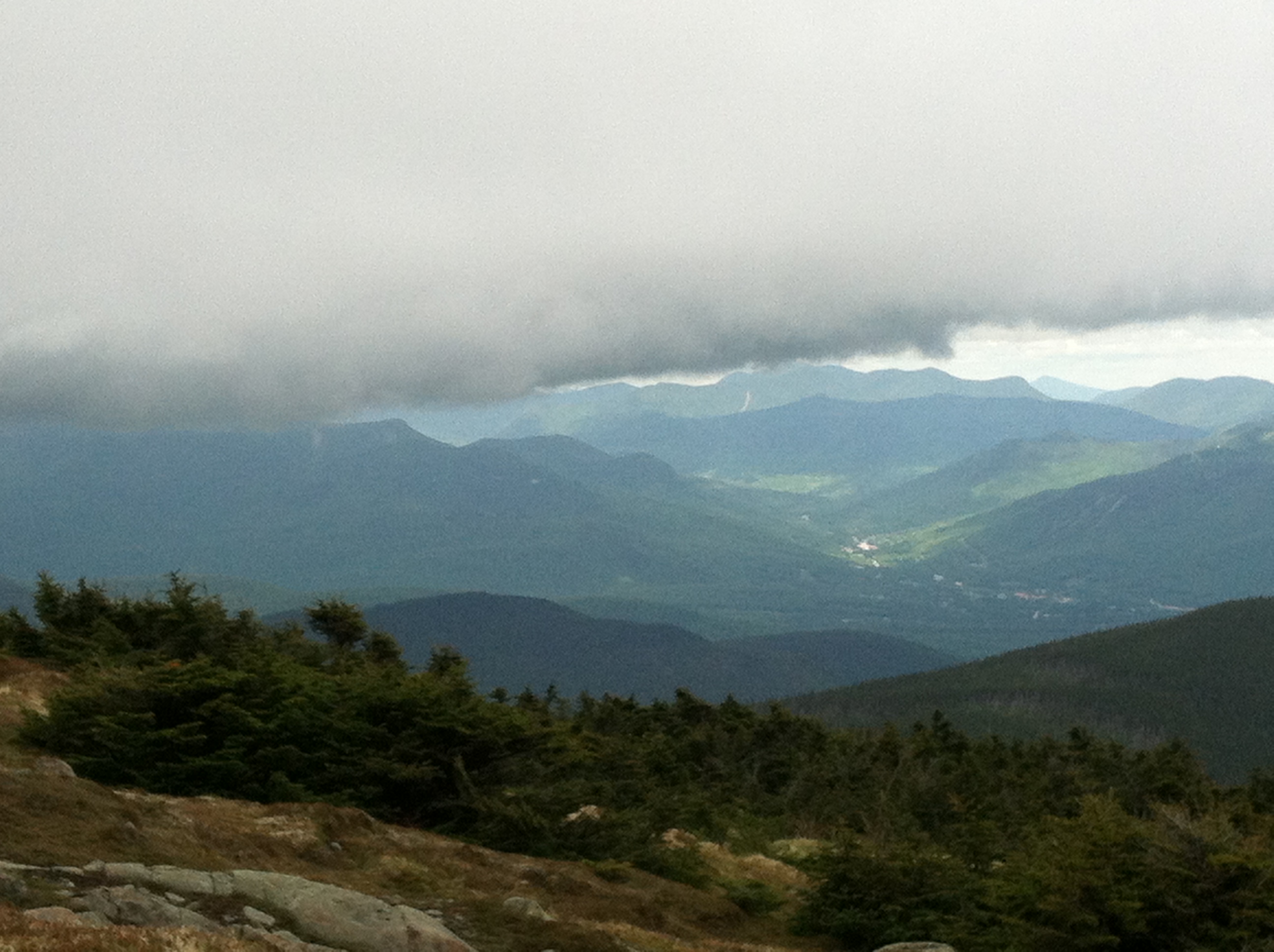 This month we not only got above the trees, we got above tree line.  And into the clouds. As we reached the summit of Mt. Moosilauke, the clouds that had been hiding the higher summits began to break into wind-blown sheets of mist, then lifted enough to open up a view of the mountains to the east.