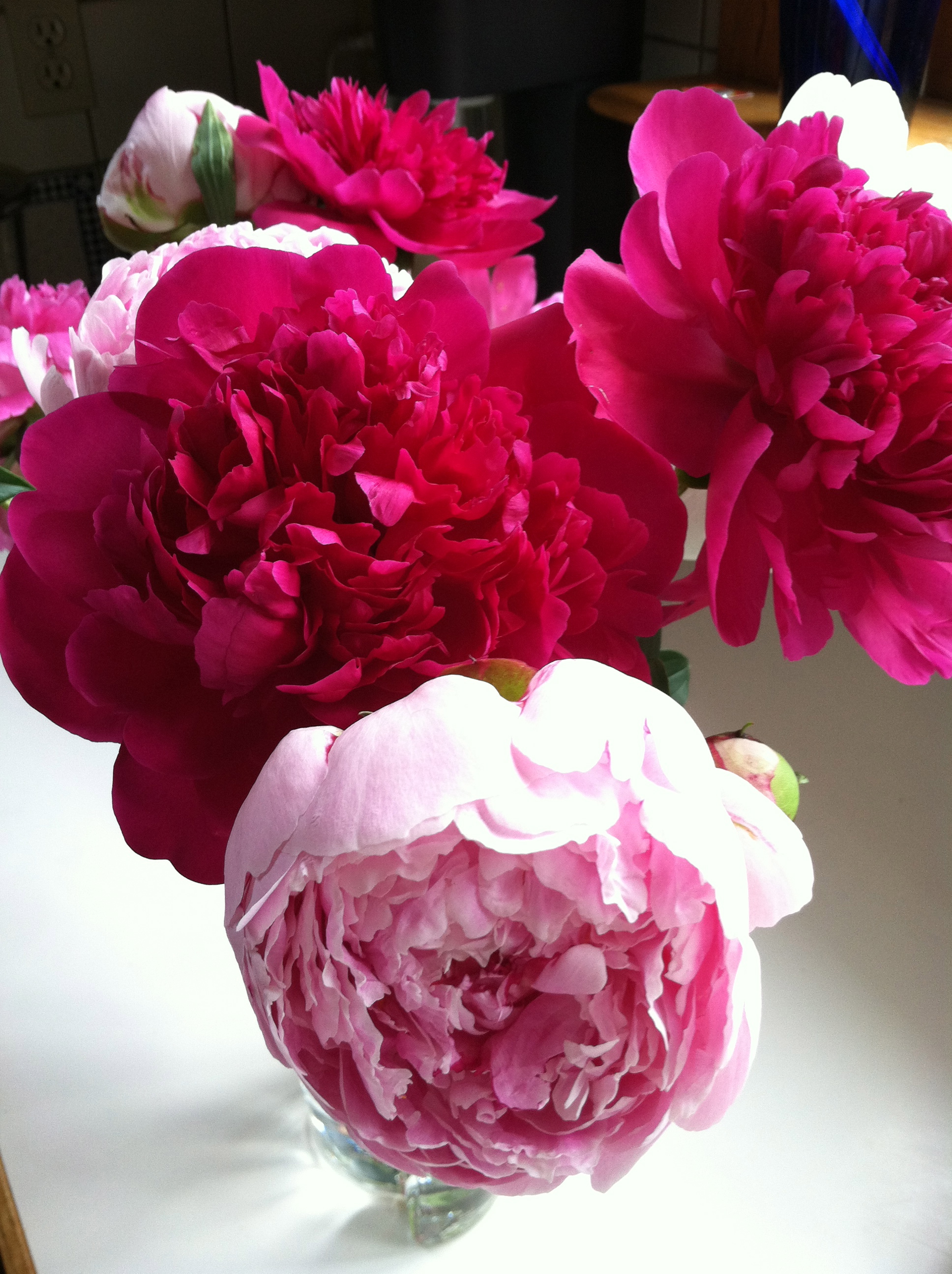 Like many people, I adore peonies.  Their lush blossoms and intense fragrance are intoxicating.  So when two recent family trips crossed into and right back out of peony season here, I was truly sorry to be leaving my peonies.