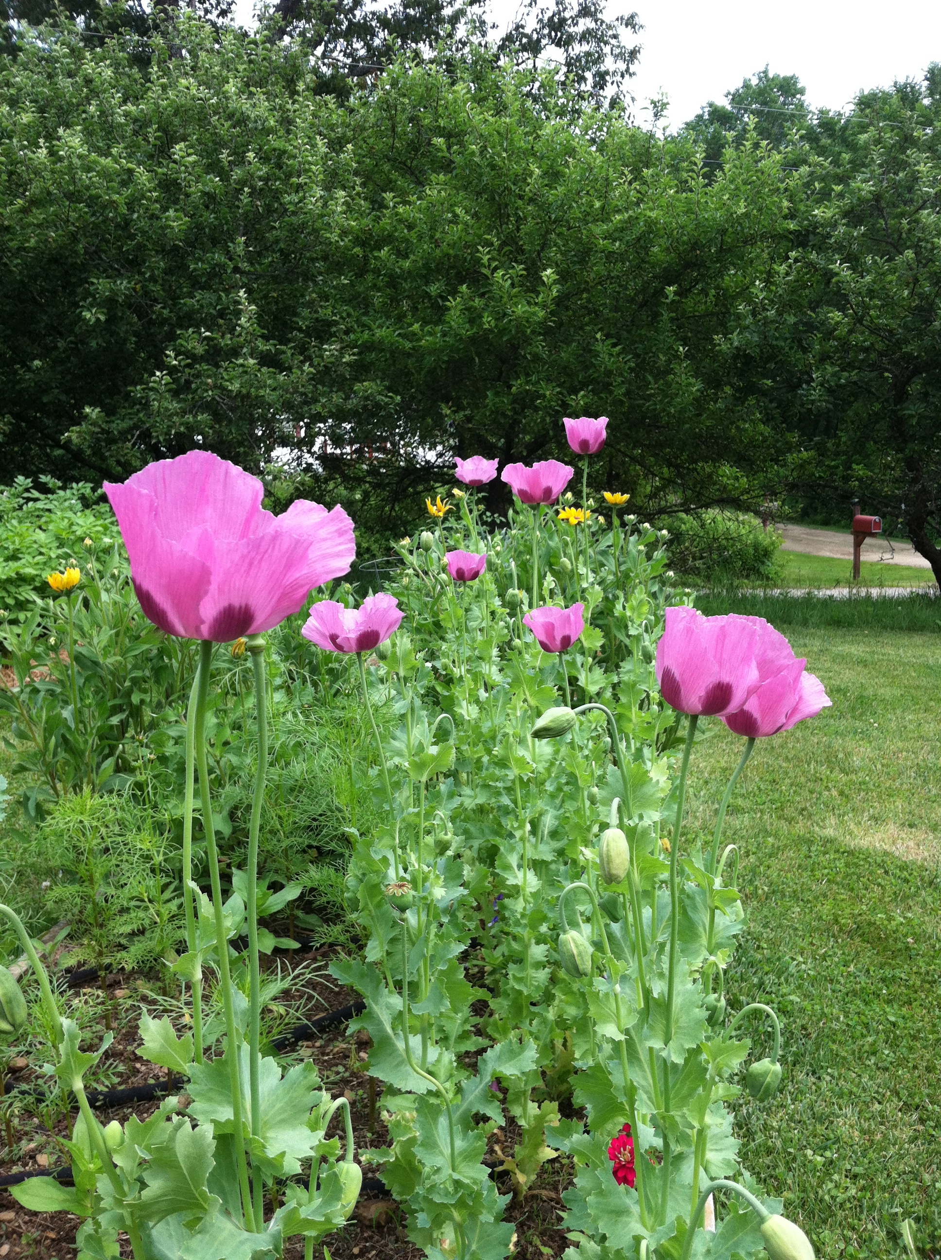 And now the annual poppies that volunteer all over my gardens are open, coming again and again from seeds I started 20 years ago.  The colors and shapes have intermixed, and now I get lavender and red and the pink carnation poppies with their shaggy blossoms which have migrated some genetic code over to ruffle the edges of other colors.  When the blossoms have frayed and left the bare poppy heads, I let a few of them dry on the stalk, break the seed head open and scatter the poppy seeds over my beds.  Next summer, poppies everywhere.