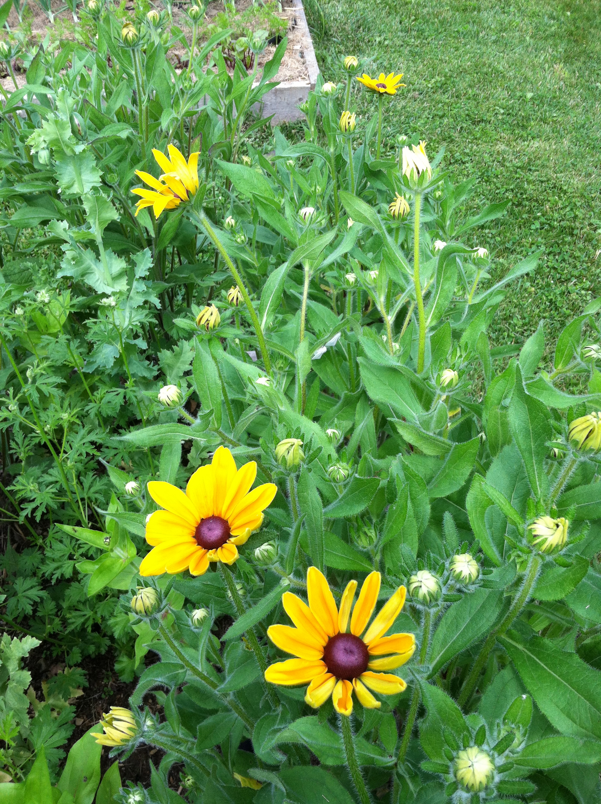 And here is the rudbeckia, also sowing itself into new clumps every time I weed another garden bed.  These flowers came from two clumps a friend dug me from her garden, and I in turn dig clumps and give them away.  I pull up and compost more than I can keep or gift.