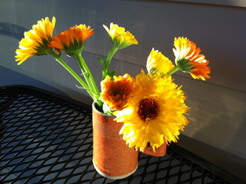 As the Jewish year of 5774 starts, I’m embracing gratitude: for the station function on Rdio which delivers an interesting mix of music familiar and new while I move around the house, processing garden bounty, cooking, kneading challah; for the flock of black birds moving through my corner of the physical landscape, flying in a twirling cloud across the yard and into a tall white pine and back into the grass of the pasture across the street, their wings beating in late afternoon sunlight like a thousand lit pages; for my health and the health of most of those I love, especially the almost miraculous continued presence, if not full health, of a beloved sister; for the reappearance of calendula in my garden, which only happened because a dear friend lost a life partner and she loved, the one who died of cancer, these flowers and we were all given packets of seeds at her memorial service in October, and now they’re blooming in my garden again, to my great delight. I picked a bouquet today when I got home from services and put it on my new table on the porch. Bright, hardy and simple, my kind of flower.