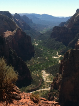 Following switchbacks up the cliff faces, we reached the top of the mesa and walked through scrub vegetation, out to a point with views down Zion Canyon.