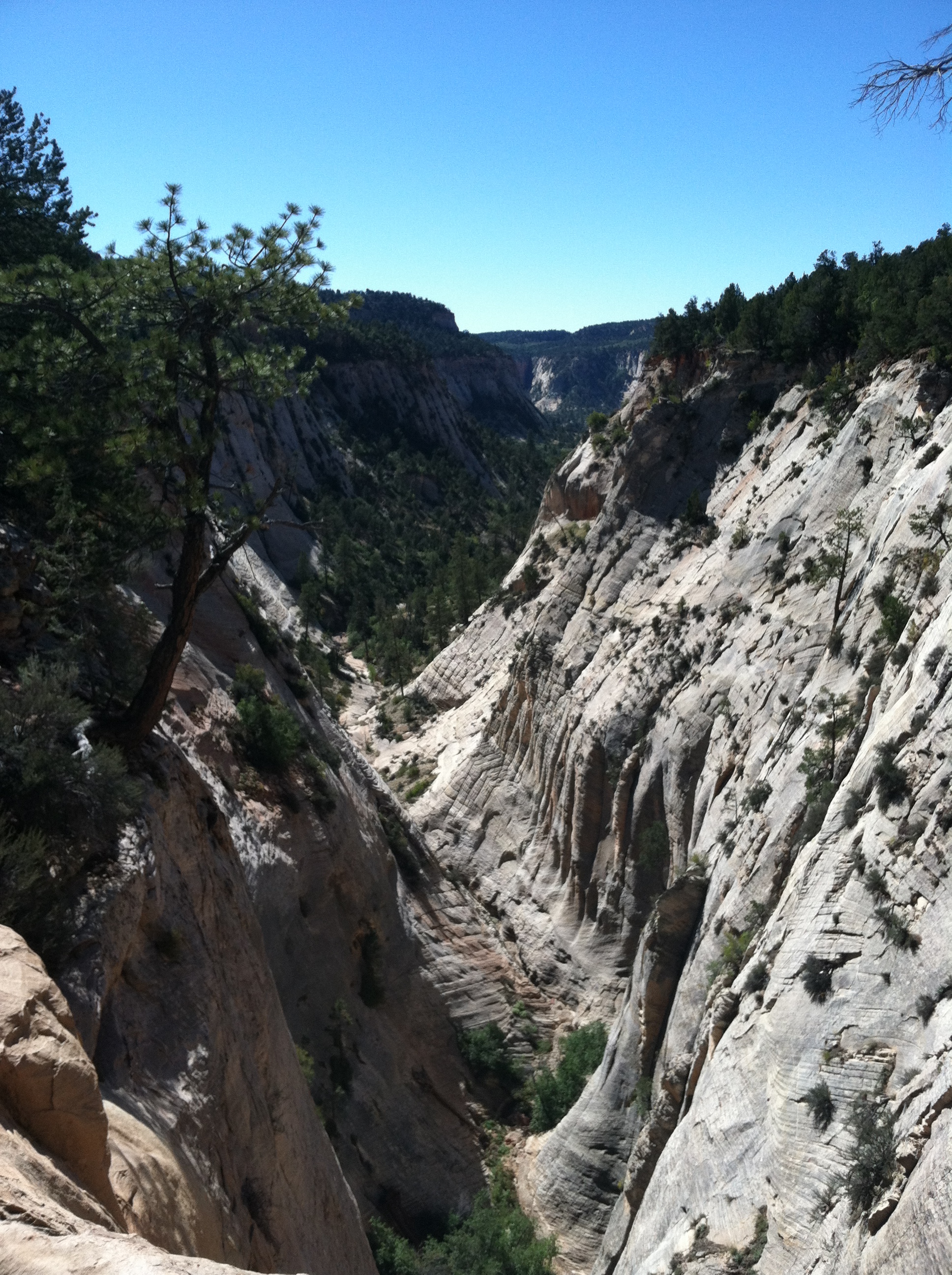 The trail was beautiful, less majestic than in Zion Canyon, but quiet and still full of an amazing variety of rock formations and views of cliffs and tree topped mesas. We only saw 6 other people during our morning hike — on most Zion trails you see 6 people in the first minute of the hike.  A man and his son were sitting at the top of Jolly Gulch, looking down the canyon when we arrived.