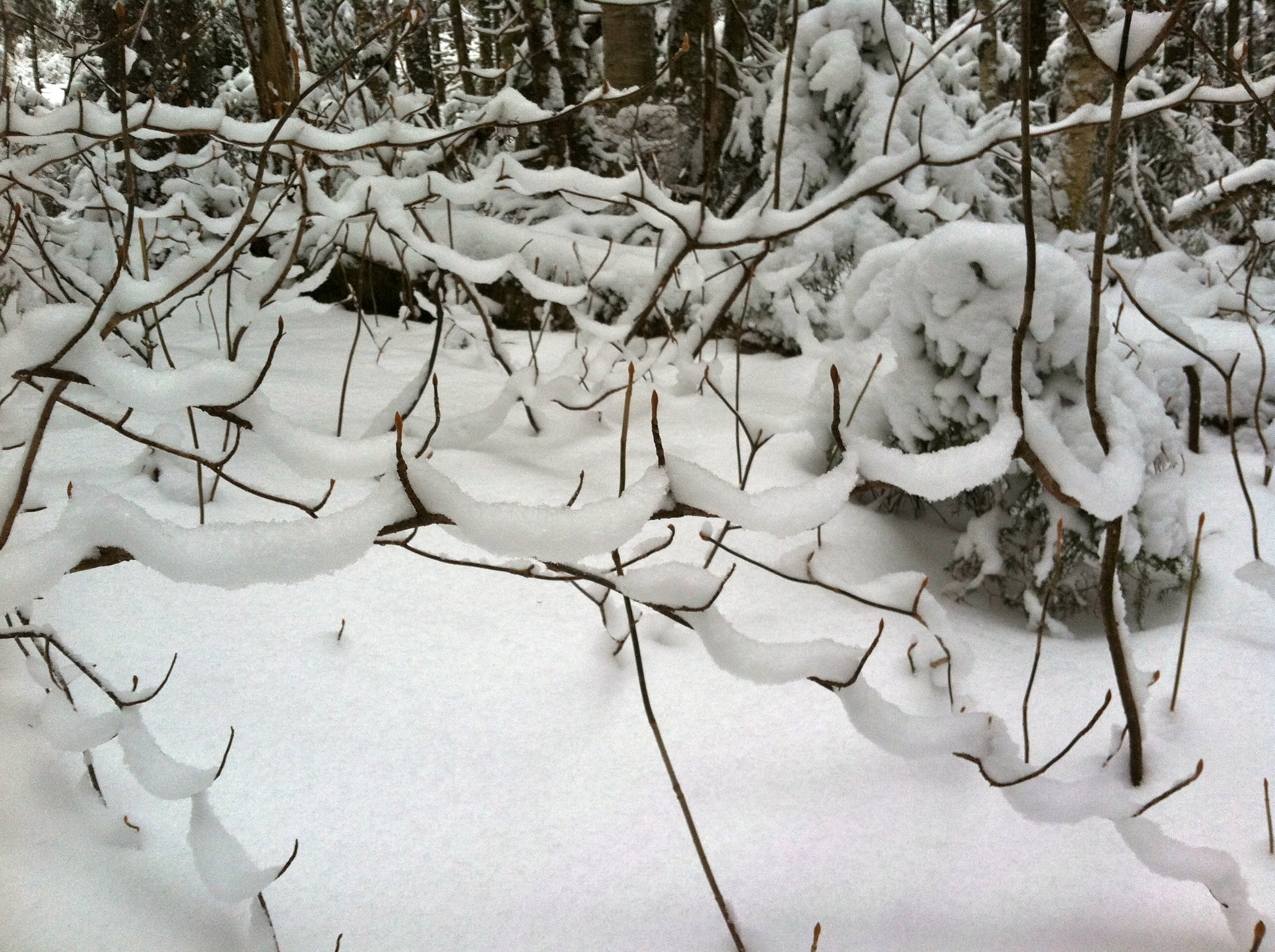 There were also snow ribbons draped in loops from the thin horizontal branches of saplings. And the always welcome ease of footing on a packed trail; even if a bit icy with rocks sticking through in spots, between new insulated boots and micro-spikes, it was a quick, easy walk.