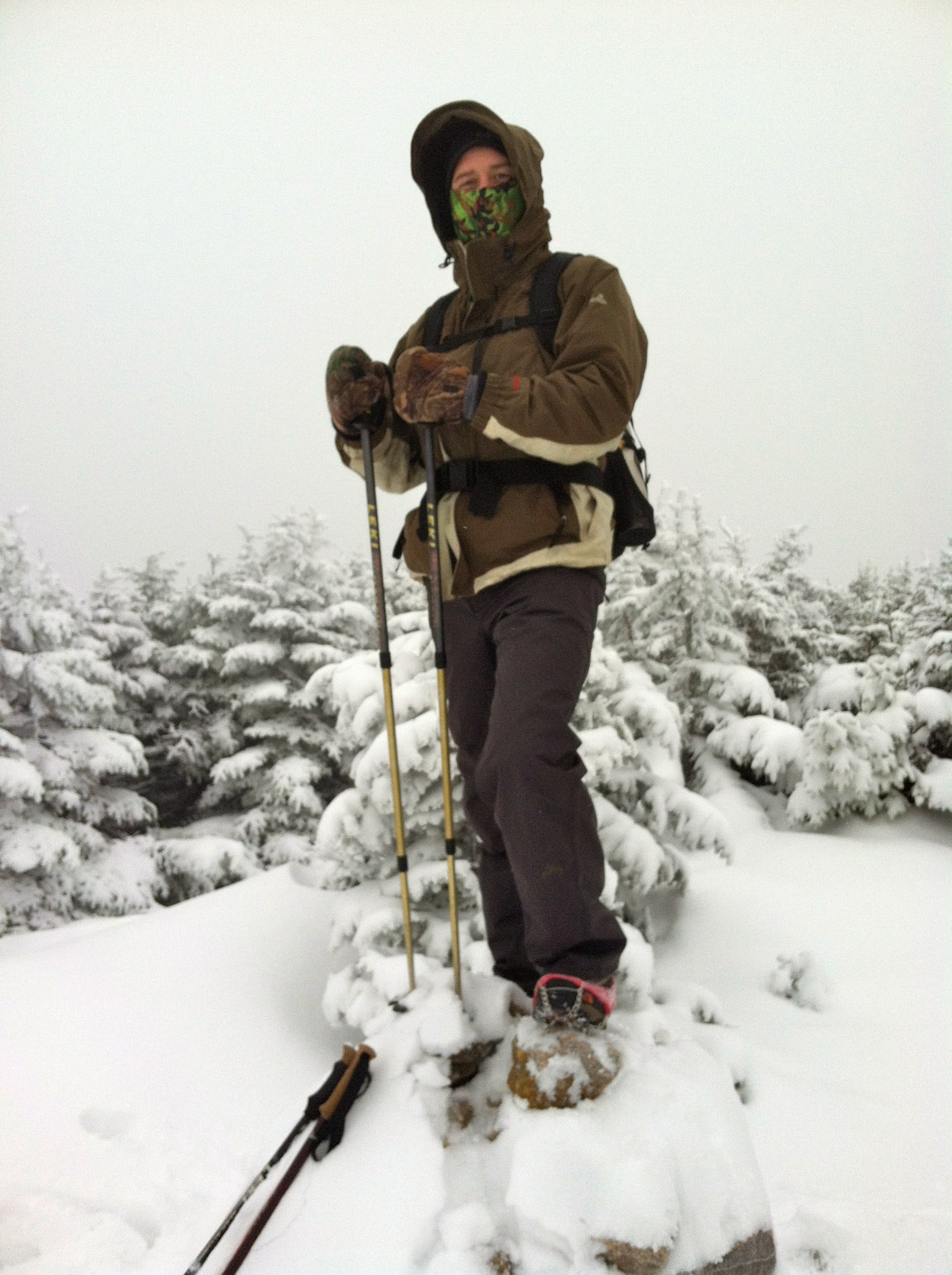 But we made did it in December, yesterday in fact. Cathy, Betsy, Sam, David and I took the Crawford Path to Mt. Pierce, the first above tree line hike we did in 2013, back in January. There was far less snow yesterday than 11 months ago, a clouded summit, and trees that looked like underwater growth, which I guess in a way they are, shrouded with ice then snow then more ice and snow until there is only a slightly tree-shaped mound along the edge of the trail.