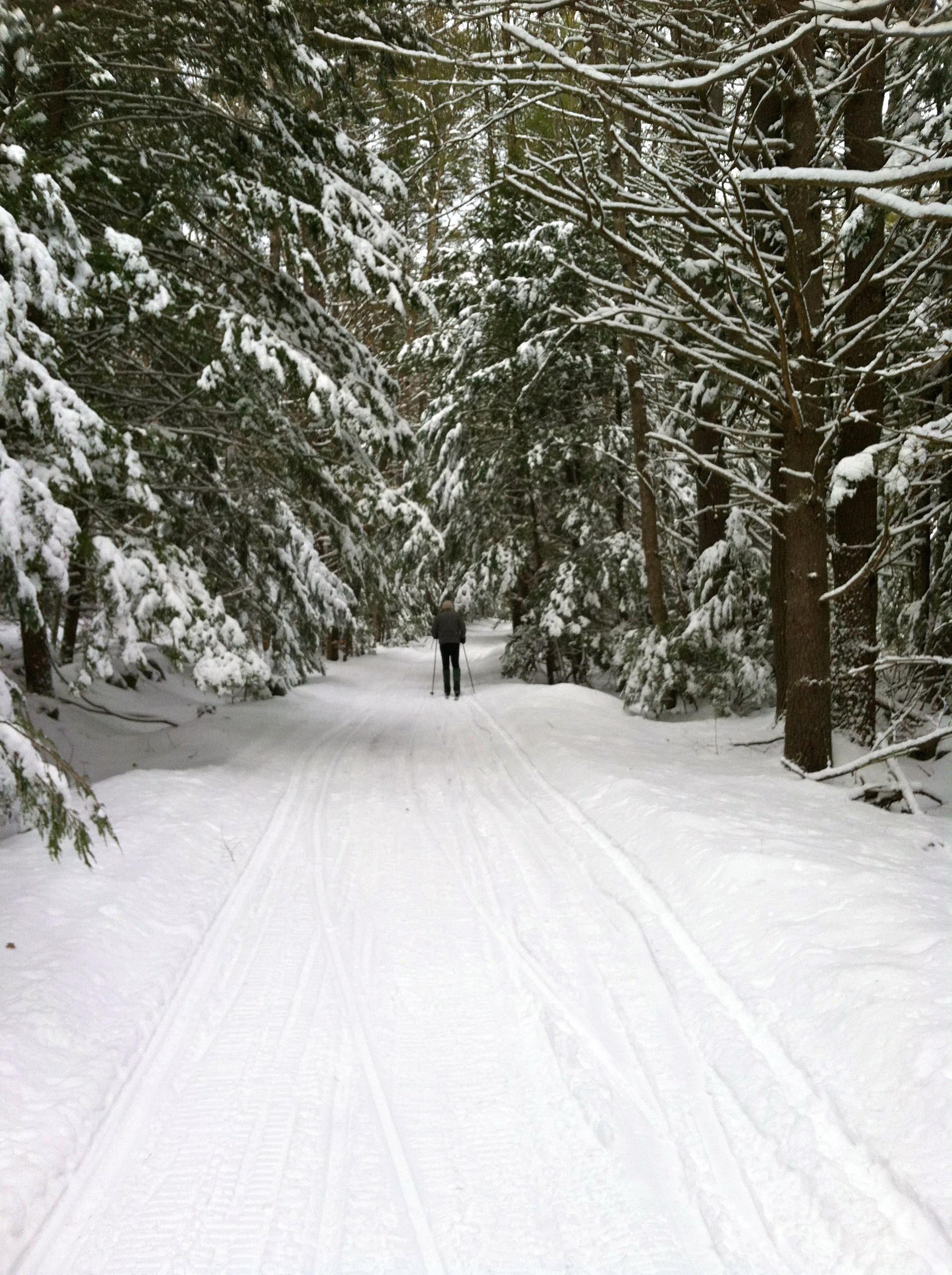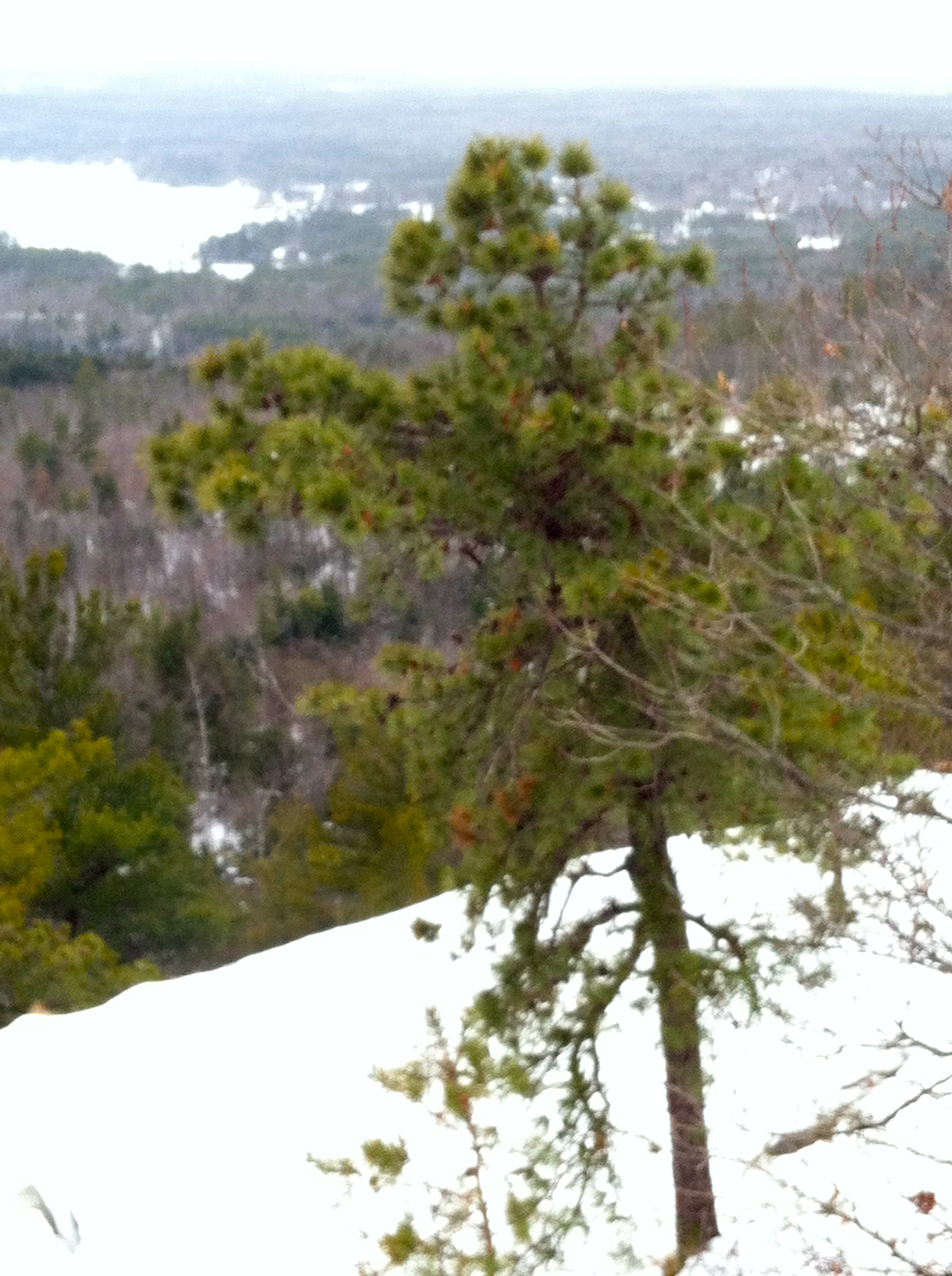 Then yesterday David and I met our new New Year’s intention of hiking above tree line, or at least to a 180 degree view, at least once a month, by climbing Parker Mountain. Standing on the cliffs overlooking Bow Lake, with a wide view to the cloudy horizon of ocean to the east, was a moment that got lots of my proper attention. But then we got home and had phone calls to answer and food to prep for a dinner and wood to stack in the barn and then it was time to go out and then time to sleep.