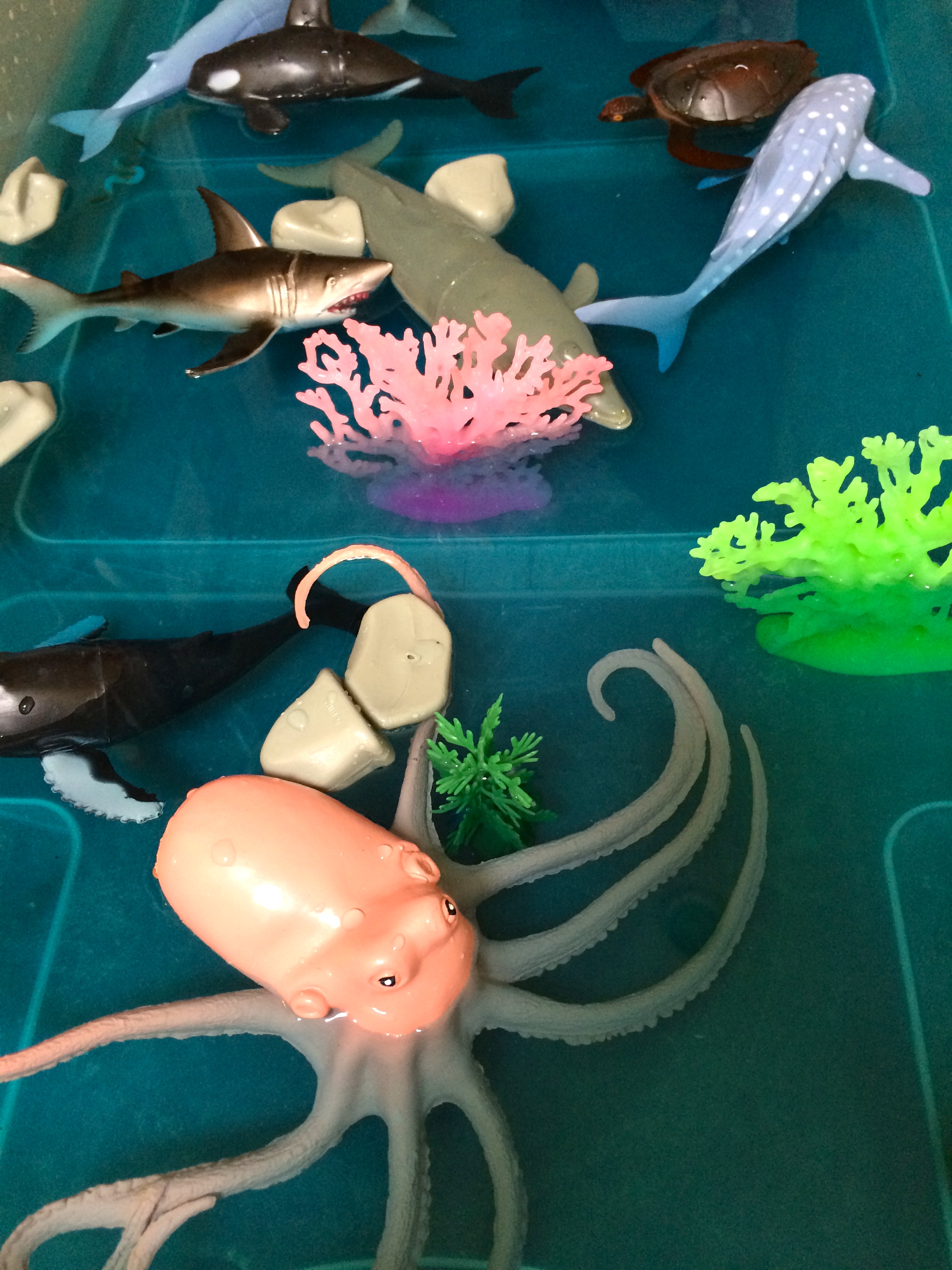 So today we did. We started with the bucket a set of ocean animals came in, but once we’d filled it with water and mixed in the food coloring, watching the dye swirl into clouds of blue and green, then piled in all the animals, the bucket was so full there was no room for the whales and sharks and octopus and turtle to swim. So Adrienne got out a long plastic tub and we poured the first ocean in then made more. Water, blue, green, swirl, animals and rocks and coral and seaweed.