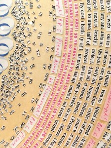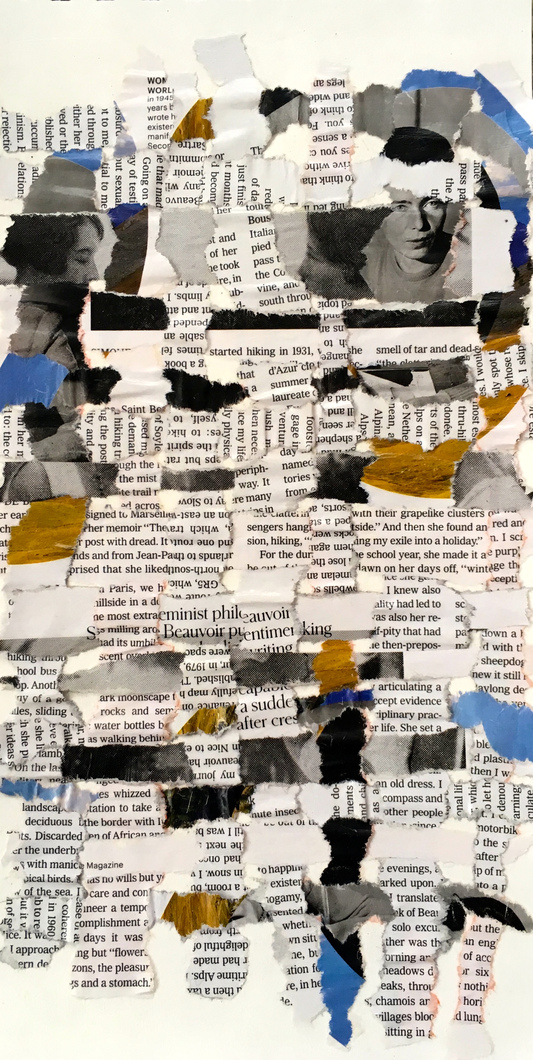 Time spent weaving a collage of newspaper strips or cutting blocks of words or gluing beads to a piece of paper for a pressure print as I listen to music can feel like slow snow — a suspension that’s going to amount to something at some point, and the creeping pace to that place feels just right.