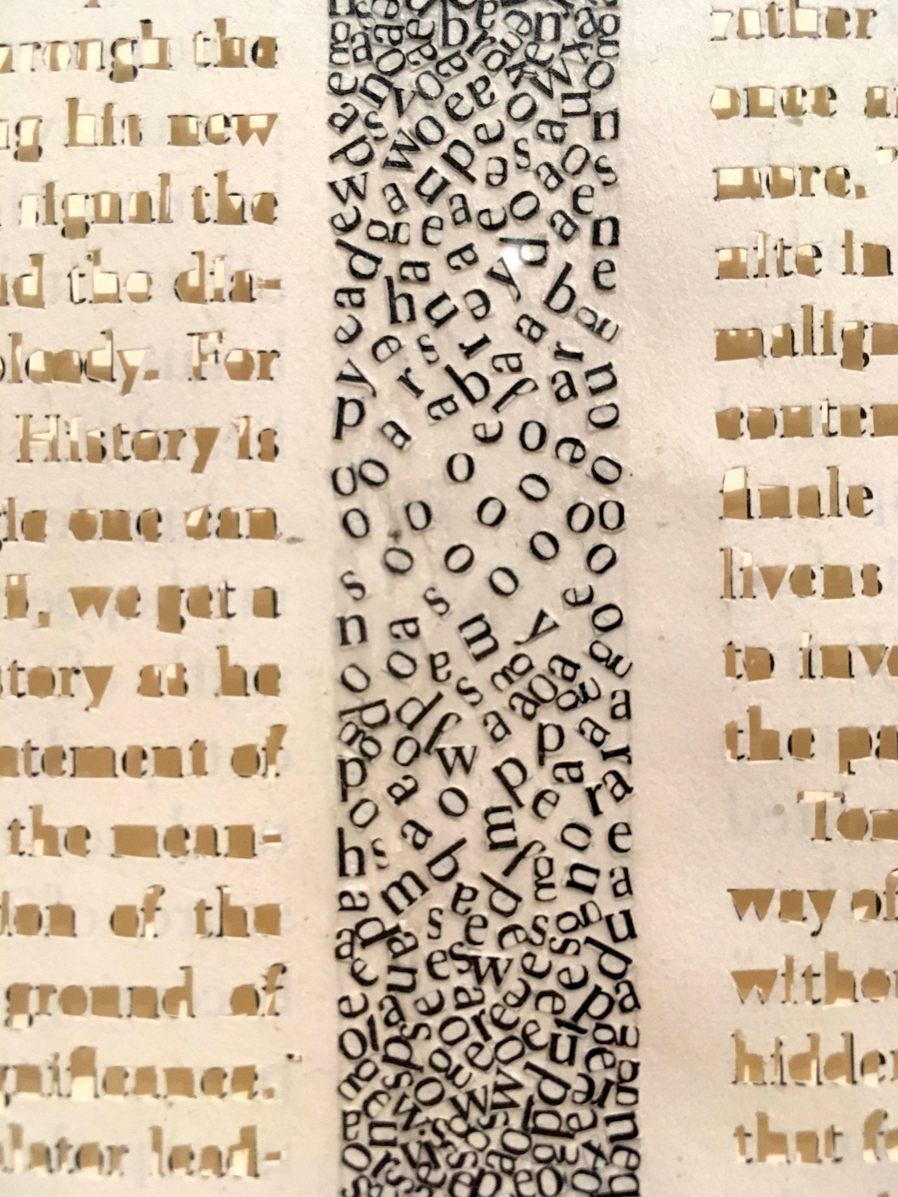 Youdhi Maharjan cut every single letter out of pages of Kundera’s The Unbearable Lightness of Being, along the exact lines of the letter, then massed them in a central column that runs through the excised pages pasted on either side. The letters are all discernible and black — you can see each letter in the cut spaces also, glowing gold from the background of the collage.