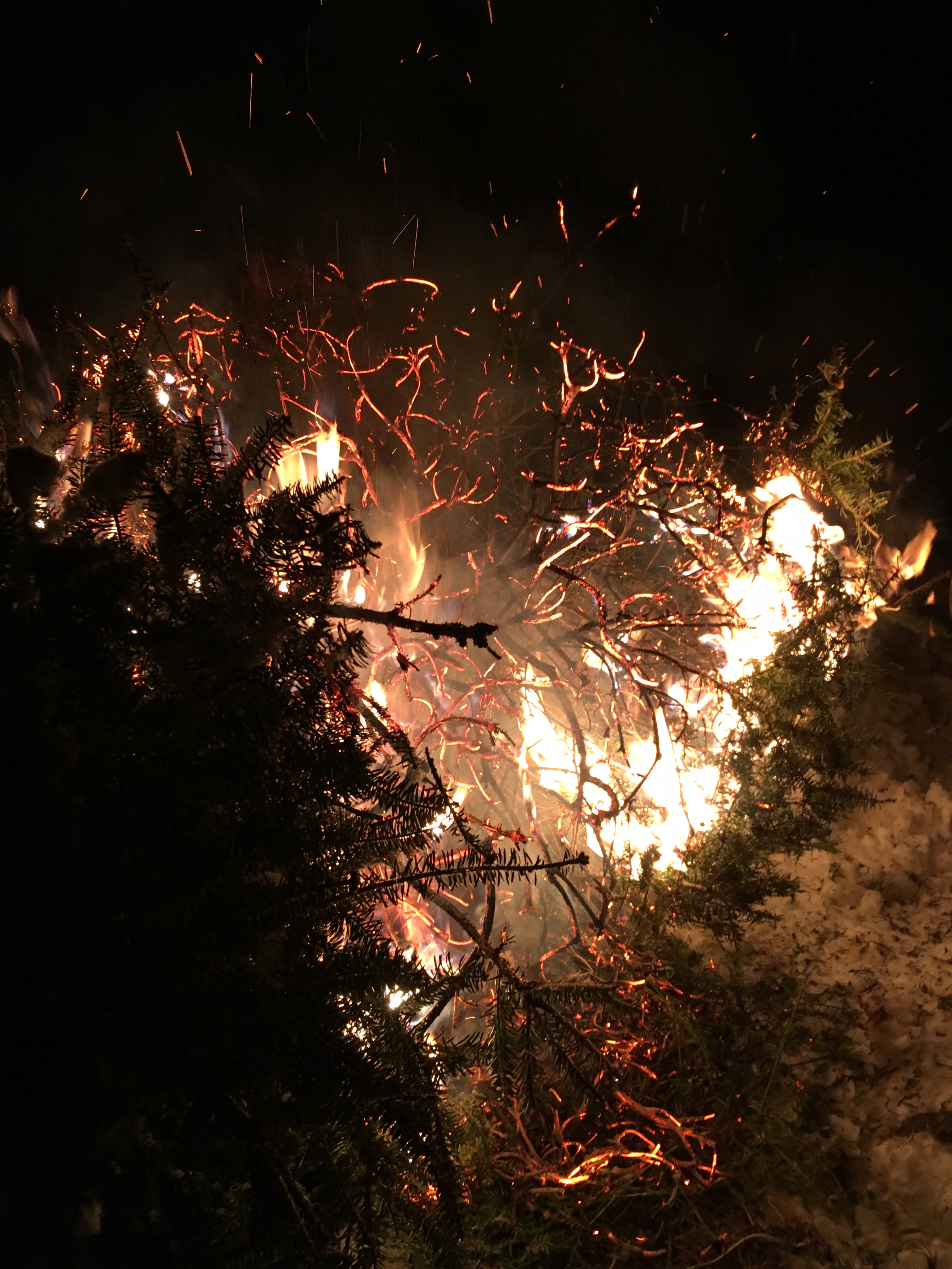 Burn it we did, drinking beer while snow swirled and slid off the solar panels on the barn roof in clumps that thumped and drenched us. We watched flames catch the limbs of the tree and curl up into the needles, hot pine burning yellow then glowing red as the fire moved on to the next branches.