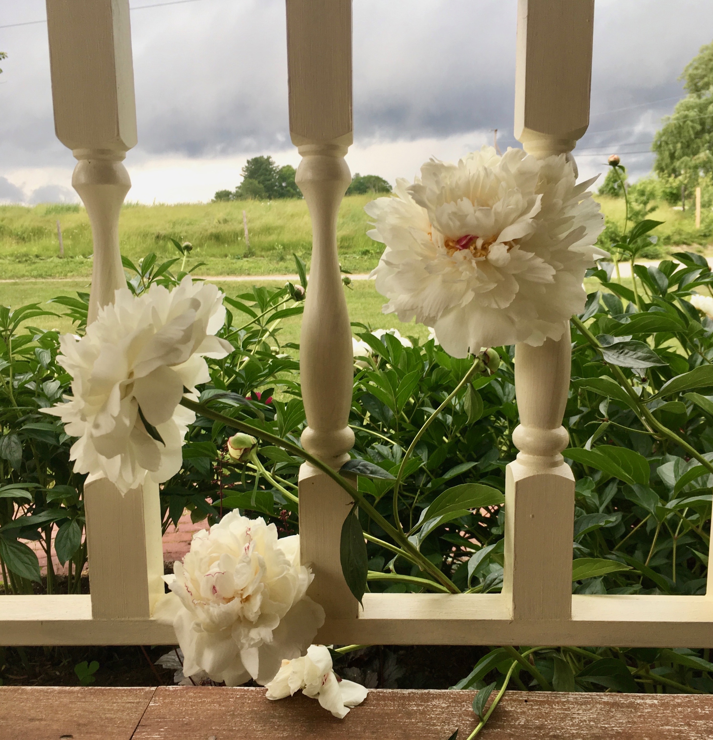 Home, on my porch, as gray storm clouds pitch across the sky and peonies poke through the balusters. For a change I’m not going to miss peony season in my yard. The last couple of years I’ve been away during the peak of peony blossoming. To extend the season, I wrapped buds in newspaper and stored them in the refrigerator. When I took them out weeks later, once I was home for awhile, they bloomed.