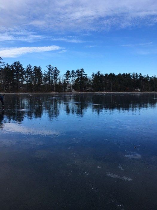 The lakes and ponds around me usually freeze gray — all those tiny white bubbles so close together they make a gray smudge, clouding the ice. This year the ice-making weather the last two weeks has been perfect for freezing water clear and I heard from two friends that Pleasant Lake froze black.