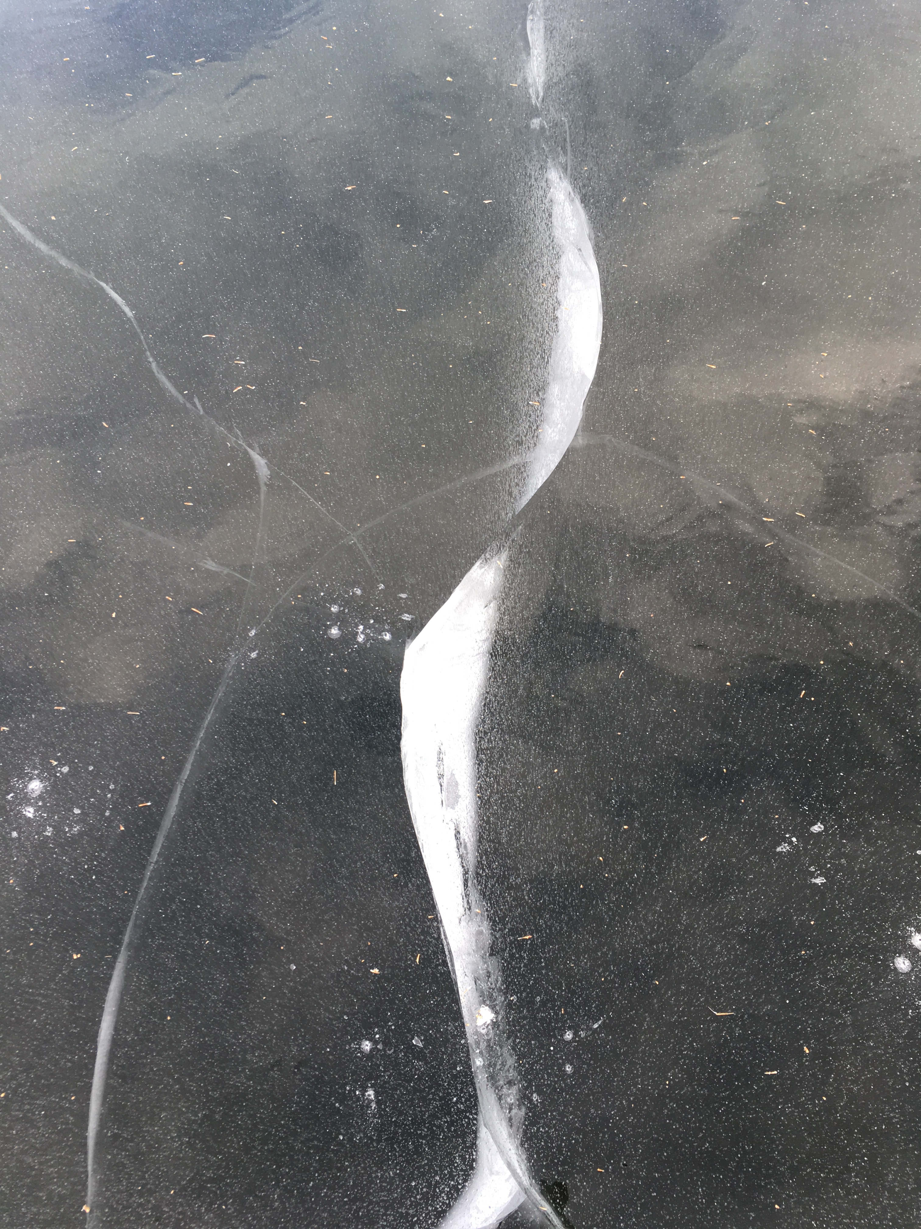 Black ice is mesmerizing. Near shore you can see leaves and moorings and lake-bottom scrum through the clear ice, cut with wavy cracks and tiny plunging bubbles of white. Where the water gets too deep for the bottom to show the ice is black, glass against the darkness of water.