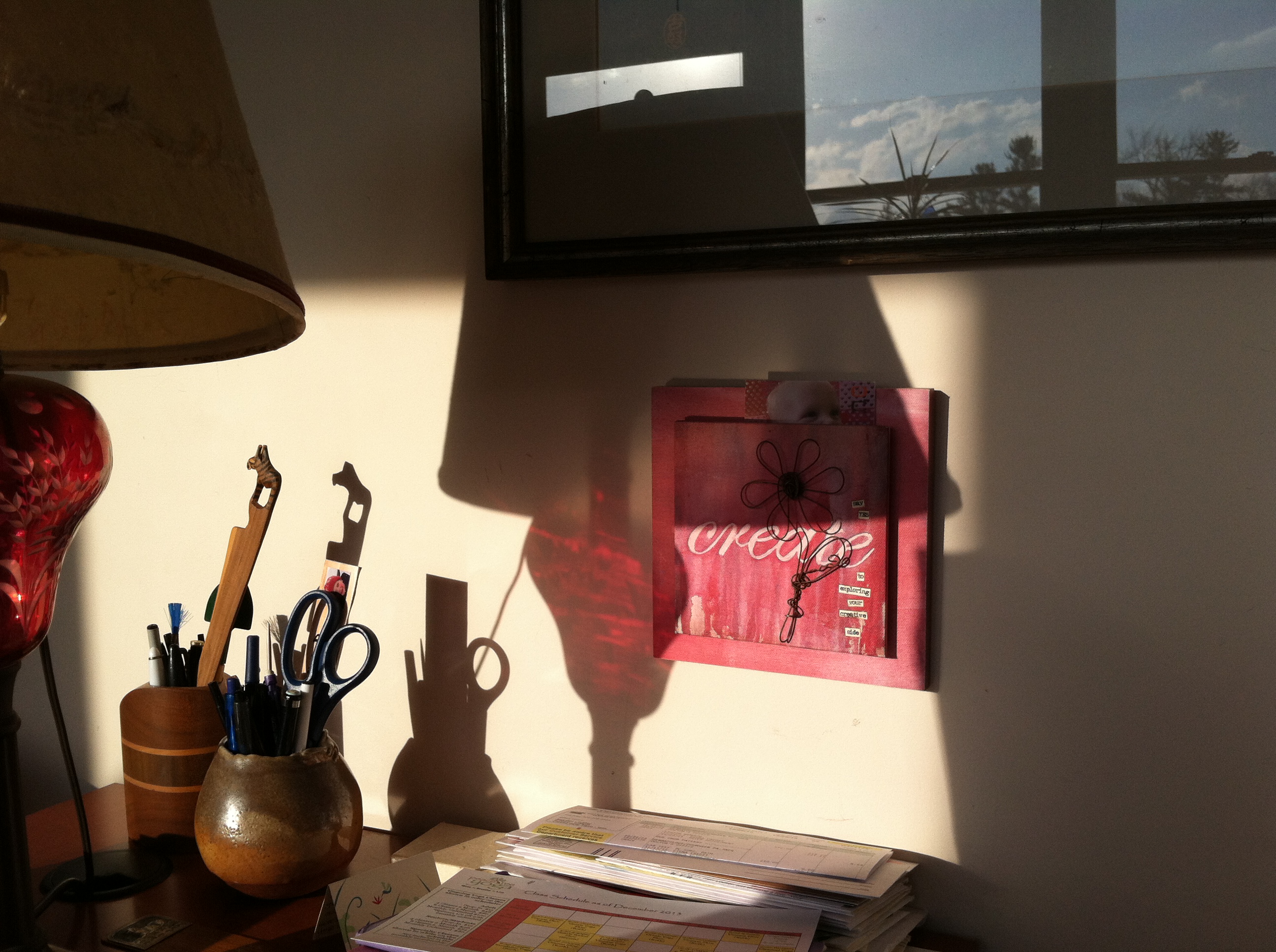 I think it might, because I’ve given myself this job of paying attention, of noticing. Today the sun has come and gone, disappearing in snow showers, then making a hazy circle in the clouds, now hitting me right in the eyes, through my study windows, brightening my desk, shadows of my lamp and pens and letter-opener sharp on the wall, a rose heart where the light is filtered by the red glass of the lamp base.