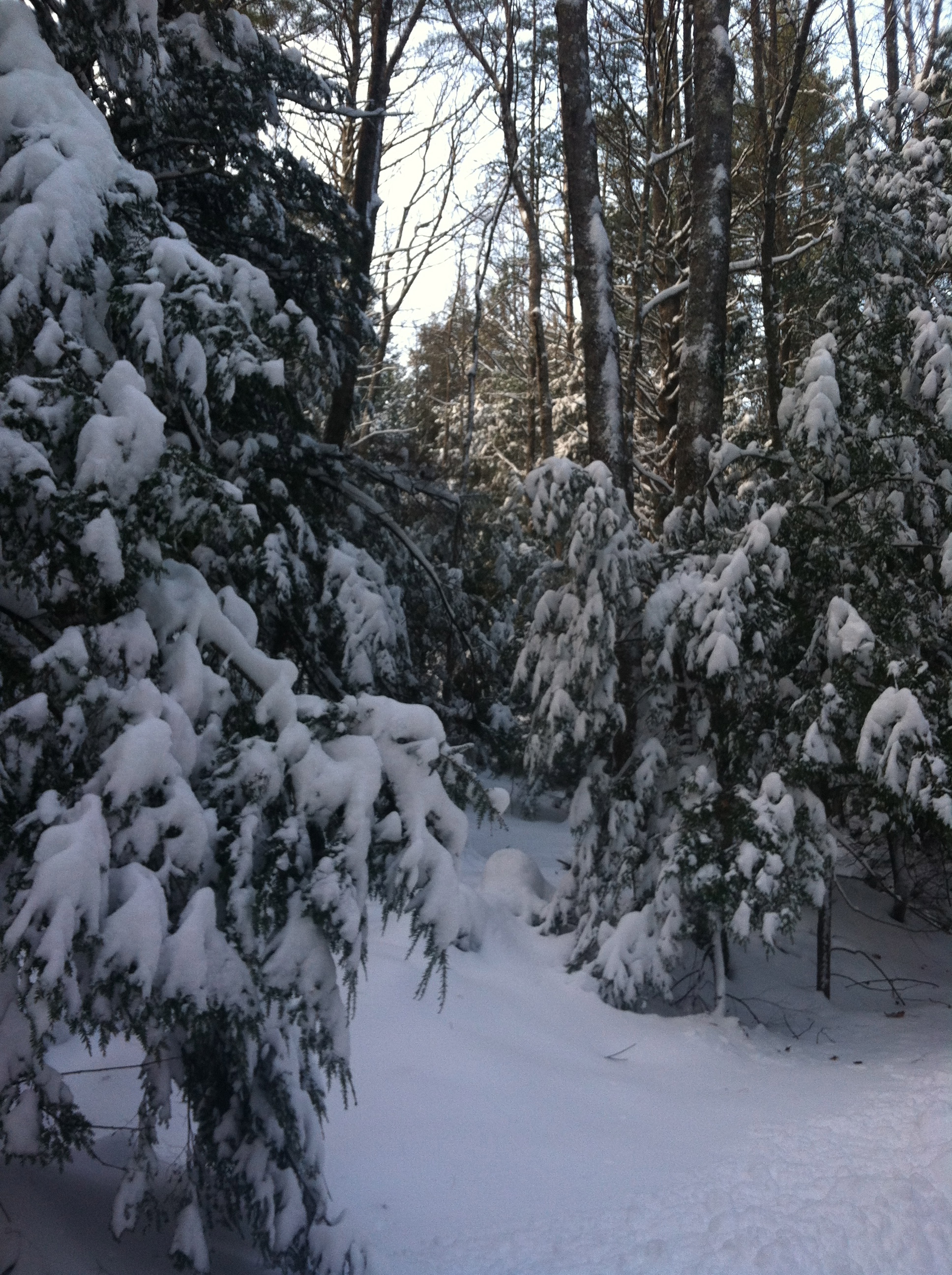 “Active with glide.” That was how Eric described what he loved best, outdoor sports that translated his effort into a gliding motion – cross-country skiing, kayaking, biking. I love it all too, and nothing better than skiing. David had skied enough before I’d satisfied my craving, and after he drove home I followed the snowmobile track over Coe Farm Road, the day turned gray again. Clouds, snow, dark pines and hemlocks, bare oaks and maples, and occasional beech saplings, still fluttering pale brown leaves. Mostly a black and white world, even the needles of the pines muted under their drapes of snow. Color isn’t what I come out into this world for.