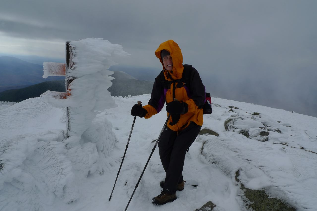 There was no fog for us, just the hard clarity of a wind whipped day, carpets of yellow and orange trees below us, wave after wave of green spruce, and the frosted summit of Baxter Peak ahead.