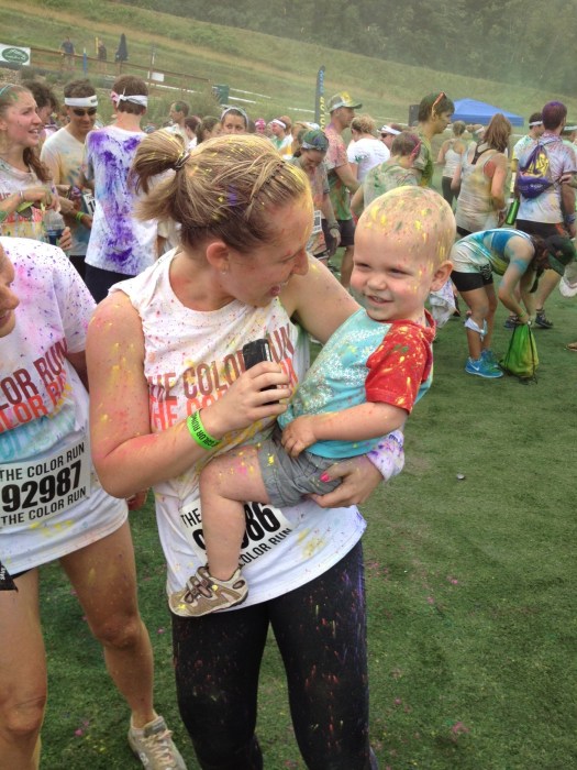 Adrienne and and her friend Jaime and I did The Color Run today and it was fun. David took care of Emilio while we ran (we did run) and met us at the finish line. We had extra packets of colored powder so we did some post-race dusting of ourselves, then went up front with the crowd to wait for the count down to throw the rest of our powder with everyone else. Not only did Emilio love it, when the burst of rainbow powder had settled down on everyone, he said, “More,” pointing his finger into the palm of his hand (sign language for “more”) and smiled. He looks good in pink and yellow and green and orange.