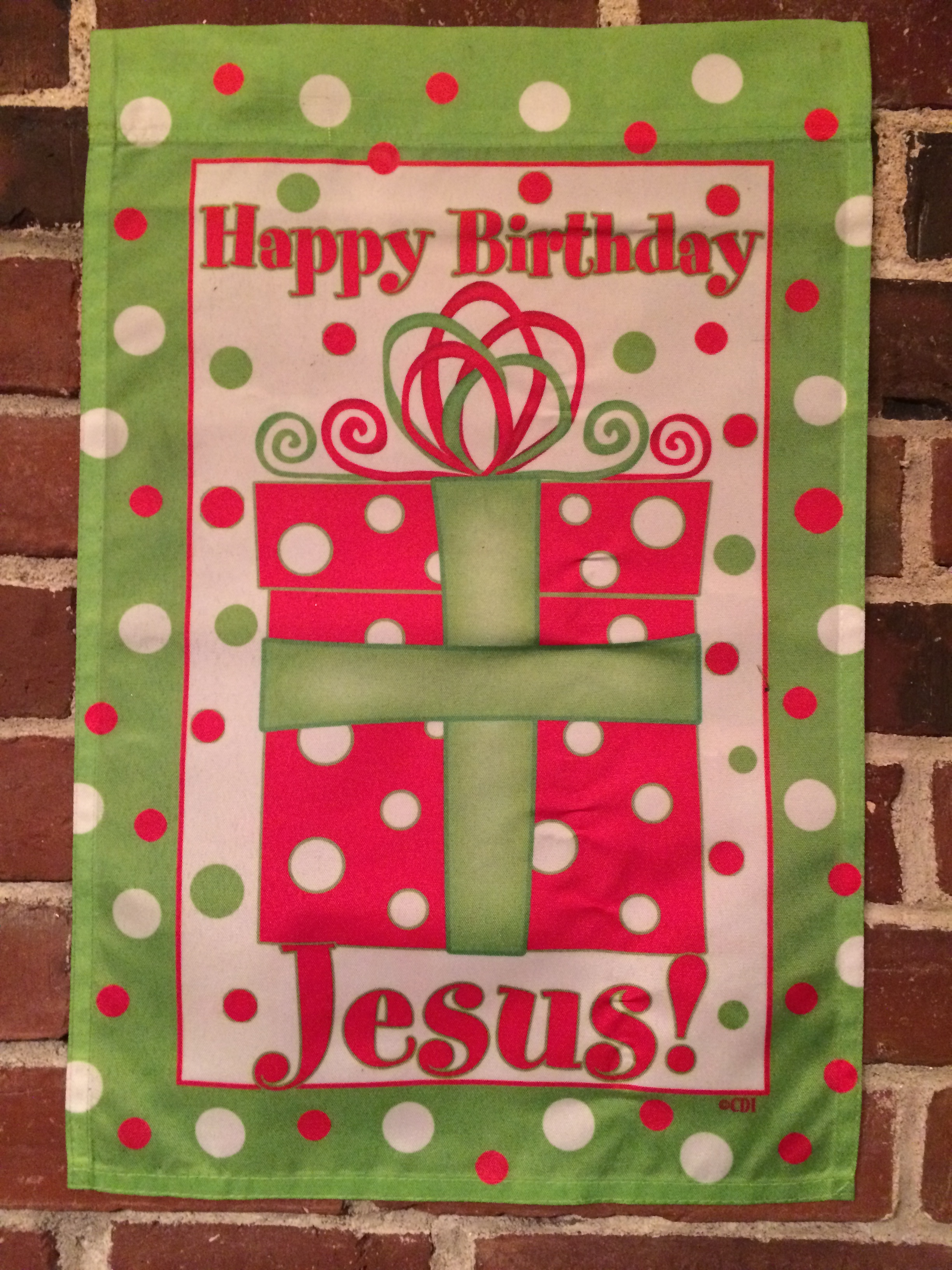 As I pulled up to our mail box last night, returning home from family holiday celebrations in Massachusetts, the headlights caught something with the ubiquitous late December red and green wrapped around the base of the pole. Positioning the car so I could snag whatever was coloring the ground underneath the mailbox, I pulled up a bright piece of cloth, printed with a birthday salutation to Jesus and a fancy gift box.