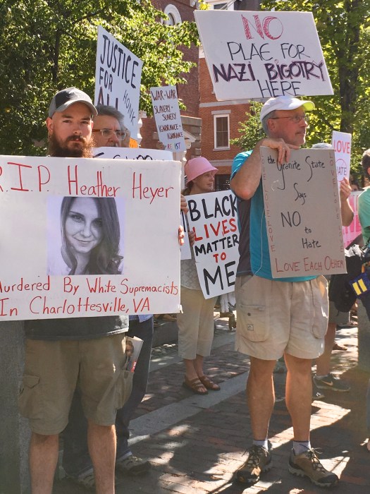 David and I went to a Stand Up Against Hate vigil today in Portsmouth, pulled together by Occupy New Hampshire. They hold a Civil Rights Sundays demonstration every week, and this week the focus was to condemn the violent bigotry of white supremacists rallying in Charlottesville, VA this weekend, which led to the death of 32-year-old Heather Heyer.