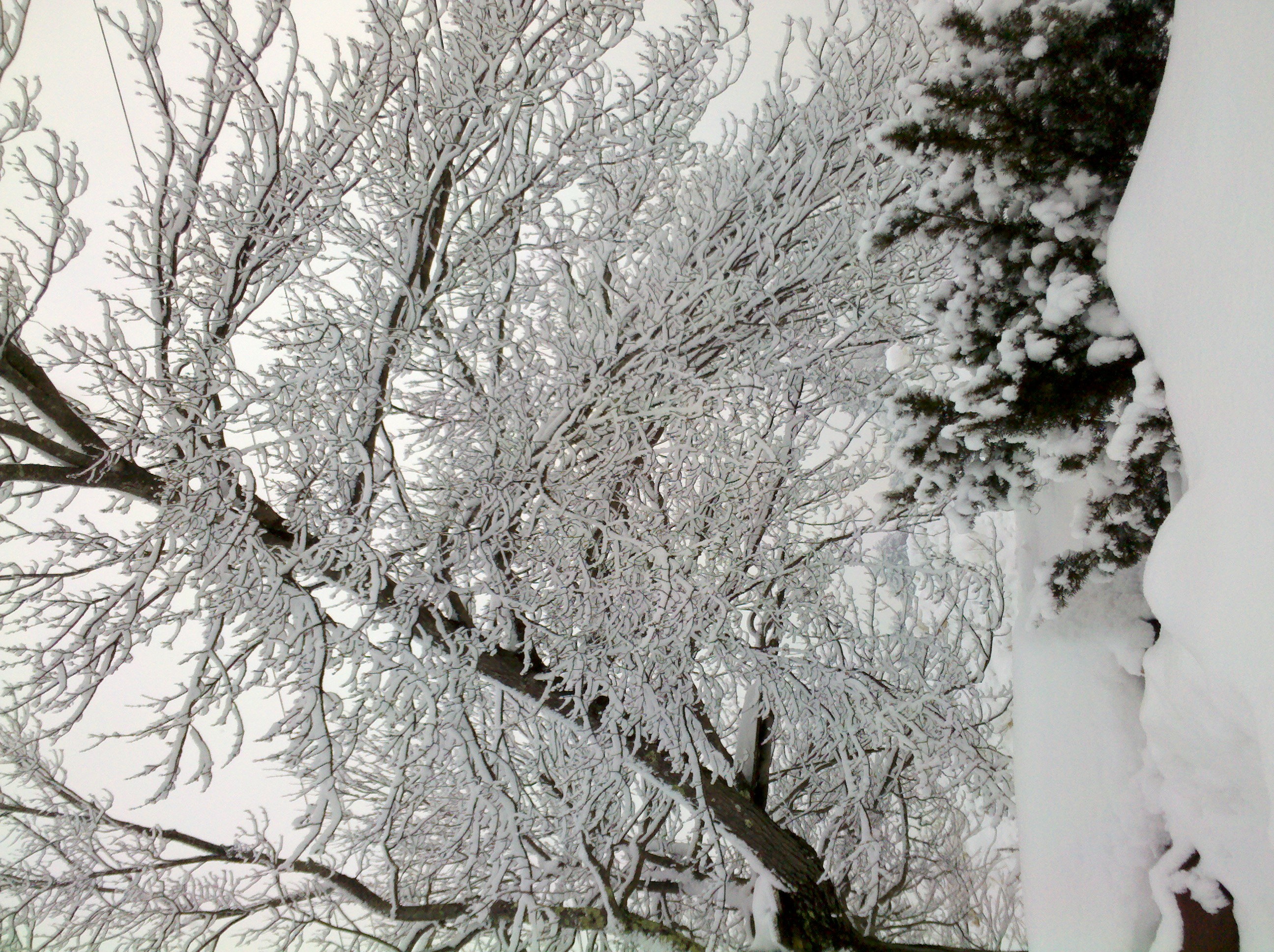 Two storms in two days, and in preparation for the second storm and the predicted dump of another foot of snow, the state more or less shut down. David and I decided early to get out into the storm for a ski, then come home to get our work for the day done. The snow was falling thick as we set out on the trail to the west of the house, blowing into us across the open fields, making the world a hazy grey. It was hard to get any sense of depth or direction as snow swirled around us. Our skis were lost under the deep snow. Our hats and neck warmers crusted as snow melted from our body heat, then froze again.